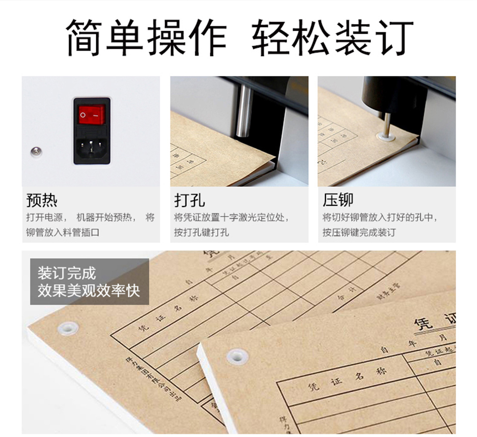 觸摸式按鍵、激光定位、自動打孔/壓鉚、自動截取裝訂管,操作輕松、省時省力。